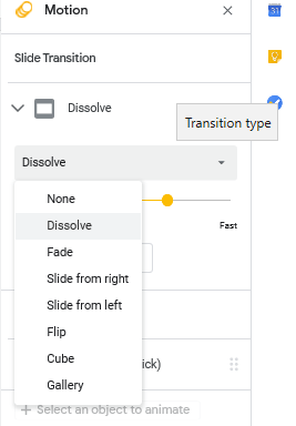 Transition: Efecto de transición es en donde se encuentran las opciones de: Dissolve, Fade, Slide from right, Slide from left, Flip, Cube y Gallery. Por otro lado, se añaden distintos efectos a la presentación y animaciones al texto dentro de la misma.