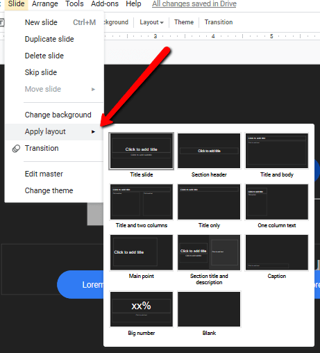 Se utiliza el símbolo ▼ para buscar los diferentes tipos de layout en los slides, entre estos se encuentran: