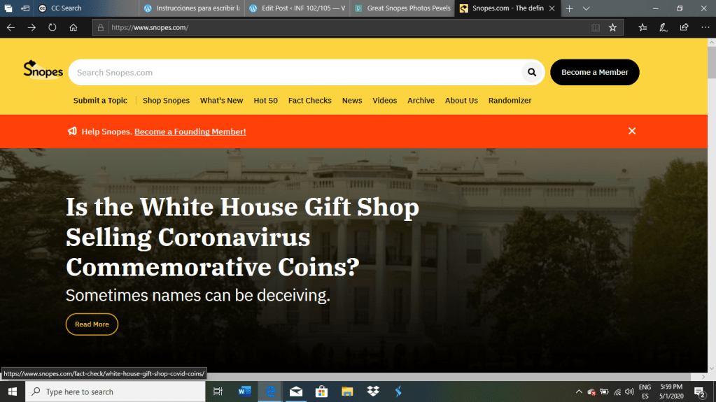 En la imagen superior podemos ver otro tema adicional conversado en la clase que trata de un website llamado SNOPES.COM el cual se nos explicó que mediante esta herramienta podemos verificar si las noticias que leemos online son creíbles o no. Posteriormente conocido como “Urban Legends Reference Pages”, es una página de internet de datos y fundamentos precisos. Se ha caracterizado como una “referencia bien considerada para resolver rumores y mitos” que vemos en redes sociales u otras páginas de internet. Incluso se ha visto como una fuente para desconceptuar y autentificar historias o leyendas urbanas similares en la cultura popular estadounidense.