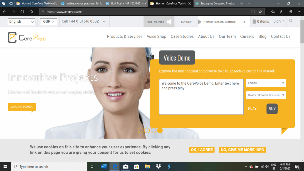 CereProc es una compañía de síntesis de voz basado en Edimburgo, Escocia y fundada en el año 2005. La compañía se dedica en crear voces artificiales de textos escritos a una voz actual que suene natural y expresiva, también crean voces artificiales con acentos regionales o países distintos y se especializa en crear clonación de voces. Incluso en la clase se mencionó que el Departamento de Defensas de los Estados Unidos investigan muy seguido los videos creados que son “deepfake” junto con esta herramienta ya que facilita en asimilar la voz de cualquier persona que de su escoge.