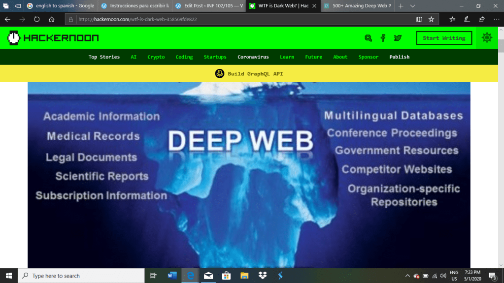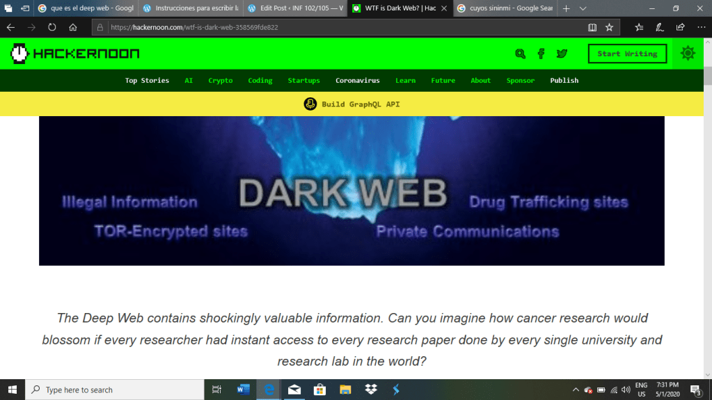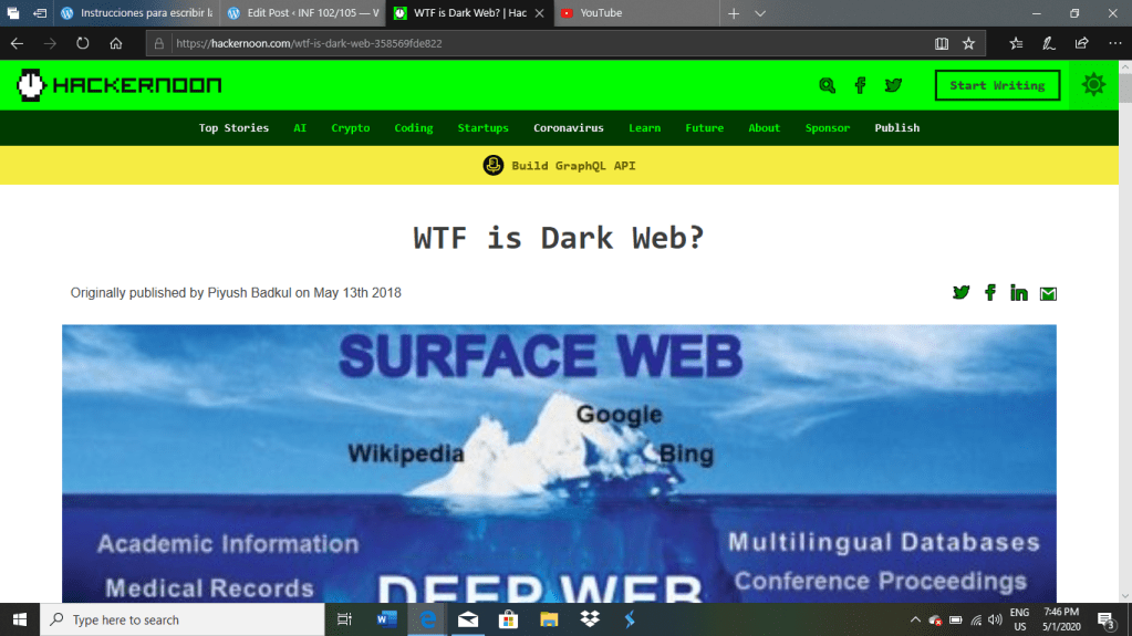 La web oscura se define como el contenido en línea encriptado que no está fácilmente hallado por las paginas de búsqueda frecuentes y usuales. La web oscura es un componente mas variado y ampliado de la web profunda que describe la mayor variedad de contenido que no aparece a través de las actividades regulares de navegación por Internet. Oprime la palabra “DARKWEB” para mas información. Para entrar al enlace de estas imágenes, también discutido el site en clase, oprime aquí.