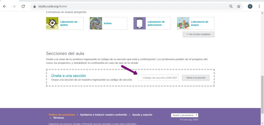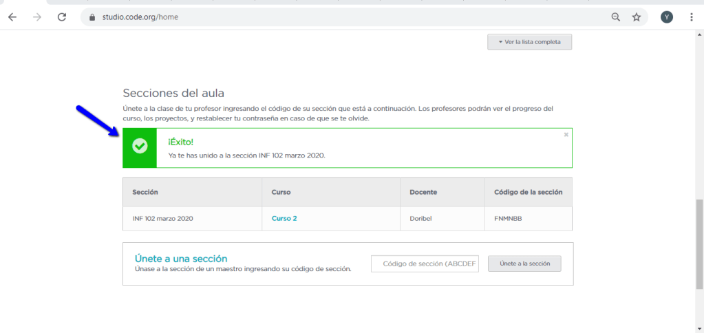 1er paso, una vez que ya hayas hecho login iras hasta la parte inferior hasta encontrarte una barra en el medio que dice “Únete a una sección” y a la derecha esta el espacio provisto para ingresar el código de la clase. Para obtener el código debe hablar con la profesora.