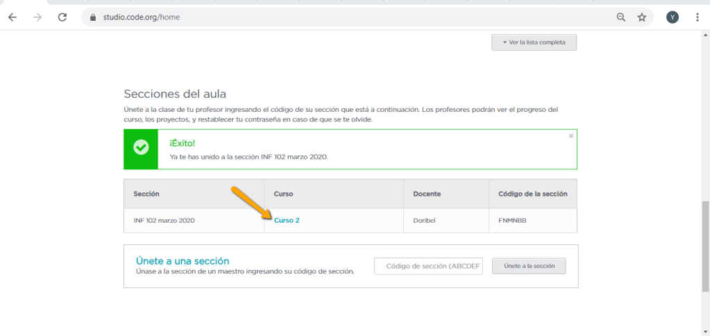 3er paso, una vez que te salga el aviso de que entraste a la sección das click encima del Curso 2.