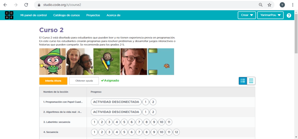 Para dar fin a la clase accedimos a la pagina Code.org que en la clase pasada se menciono que se tenia que tener una cuenta. Para acceder estaré compartiendo los pasos.